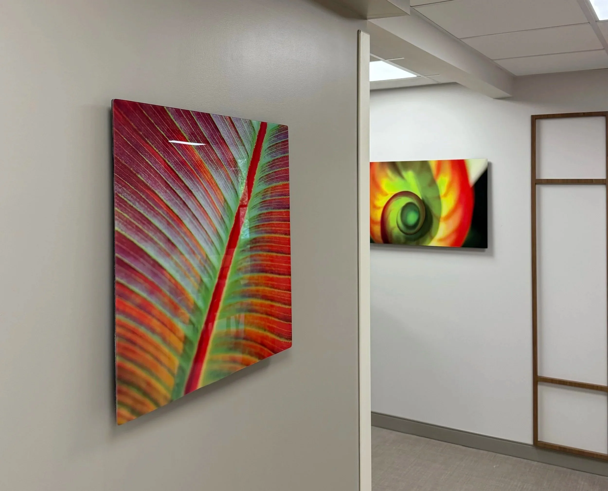Print your image on acrylic plexiglass, any size up to 4 × 8 feet. A frame is affixed to the back of the print for easy hanging, simultaneously creating a modern, floating look.